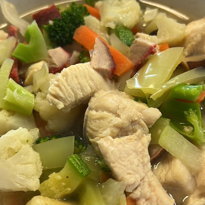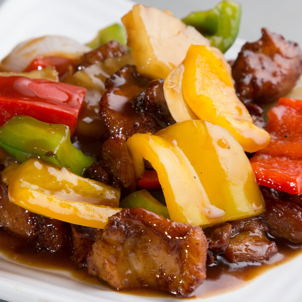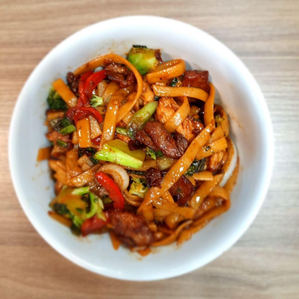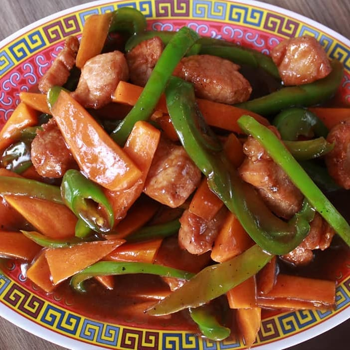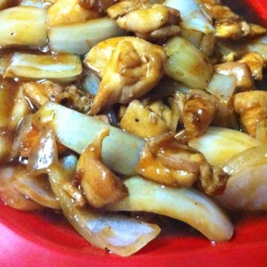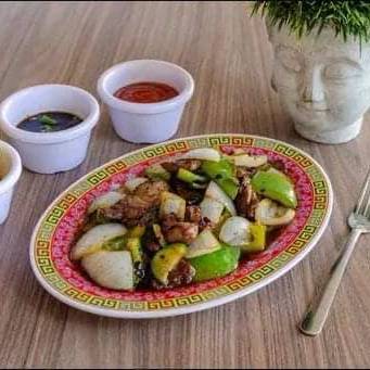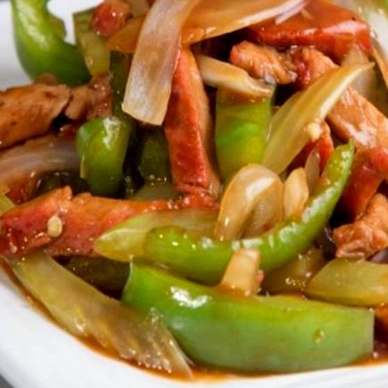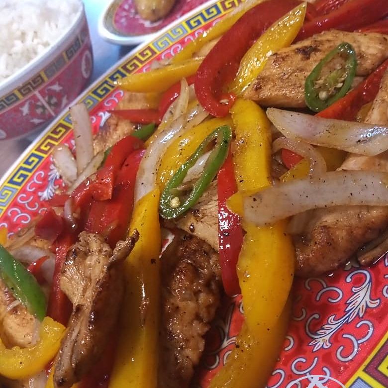 tiras de pollo con morrones,cebolla y chile serrano y caribe salteadoas en aceite de oliva
